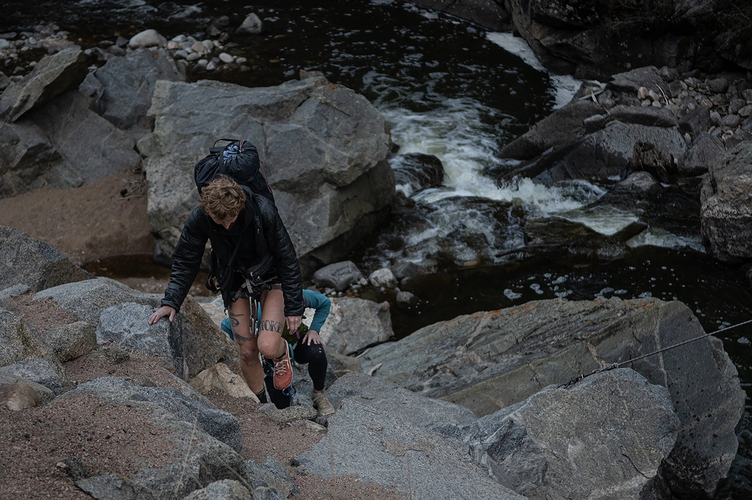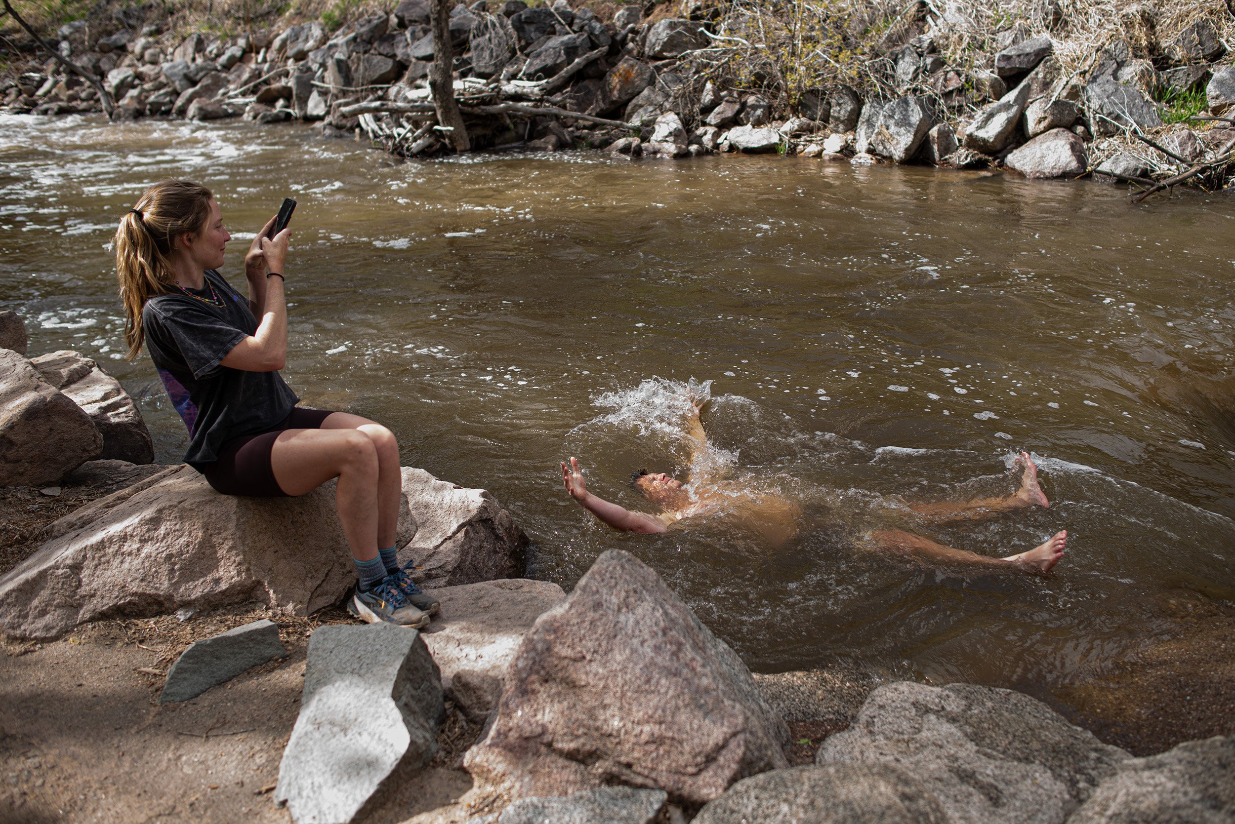 On April 30, 2024, after finishing climbing for the day, two hikers cross Boulder Creek with ease. (Jillian Vallance)