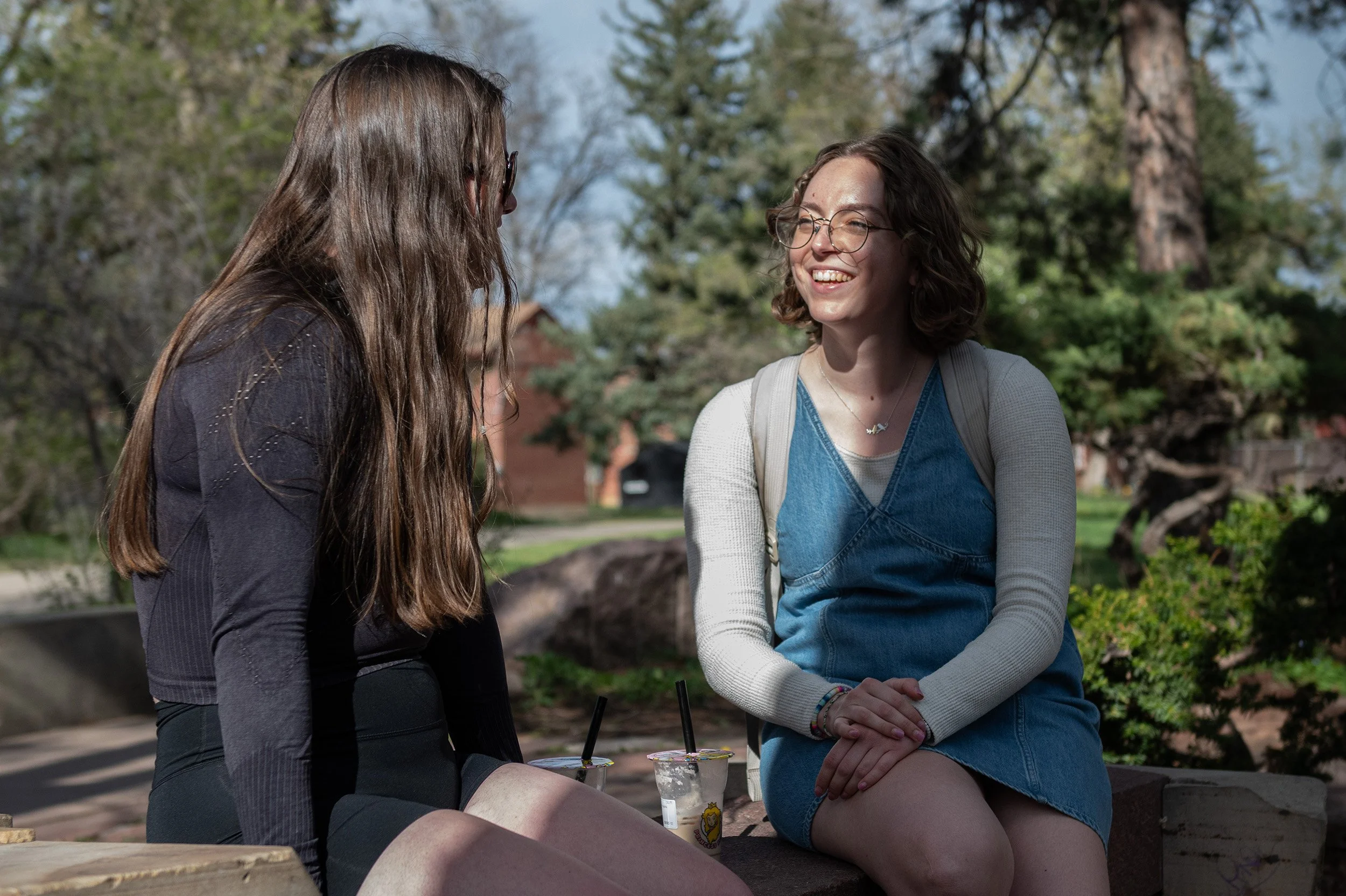 Katie and Trinity sit and catch up with each other on a bench by Boulder Creek right off Grandview Avenue in Boulder, CO on April 22, 2024. (Jillian Vallance)