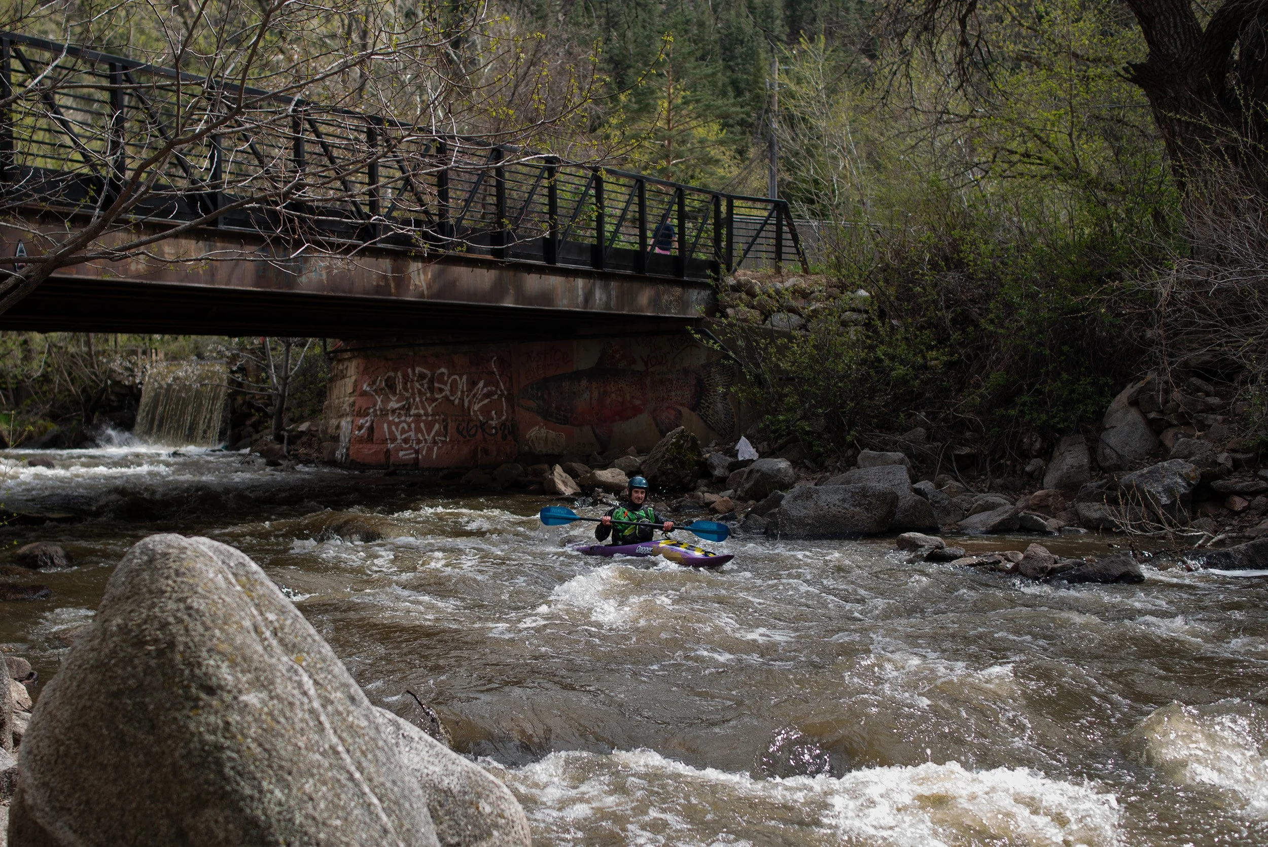 On April 29, 2024, a kayaker crosses under an overwater bridge, marking a junction between the mountainous end and the urban end of Boulder Creek. (Jillian Vallance)