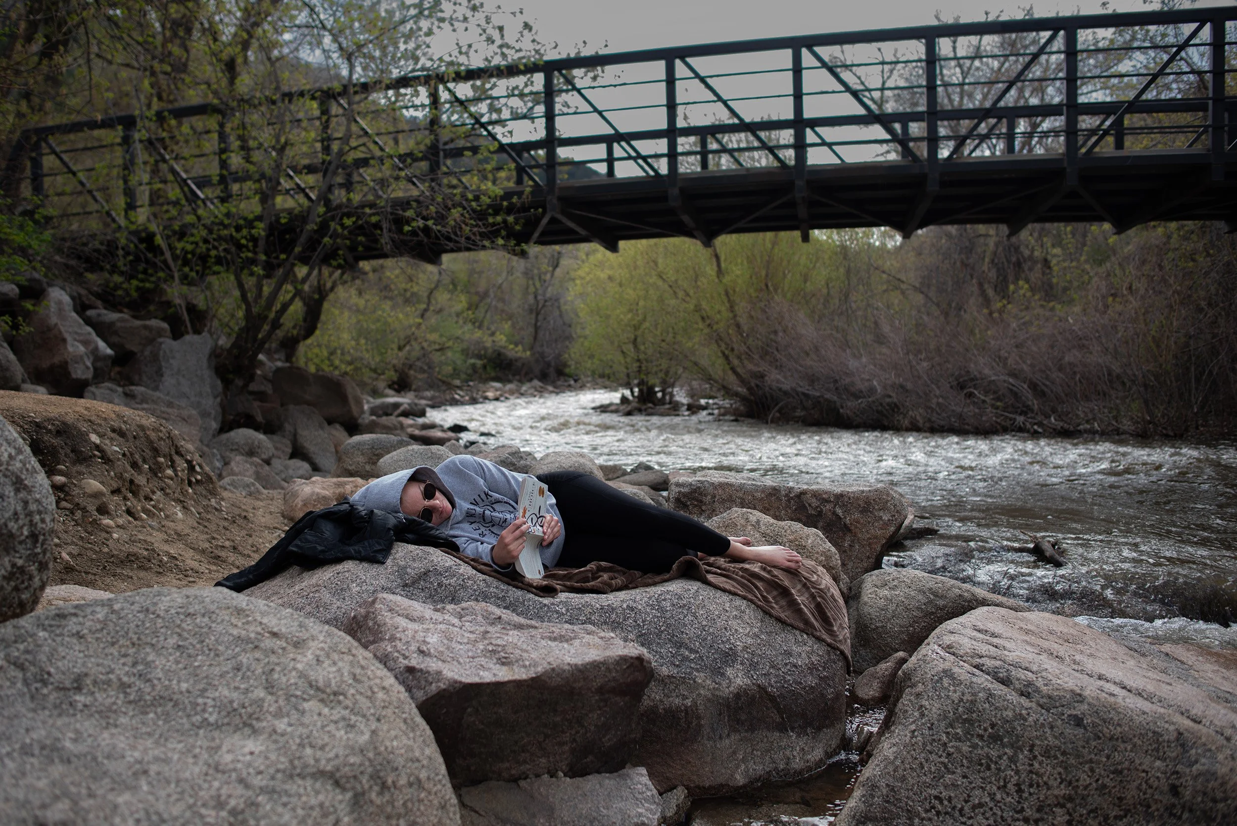 Lily, a graduate student at University of Colorado, Boulder, spends her free time reading by Boulder Creek at Eben G. Fine Park on April 29, 2024. (Jillian Vallance)