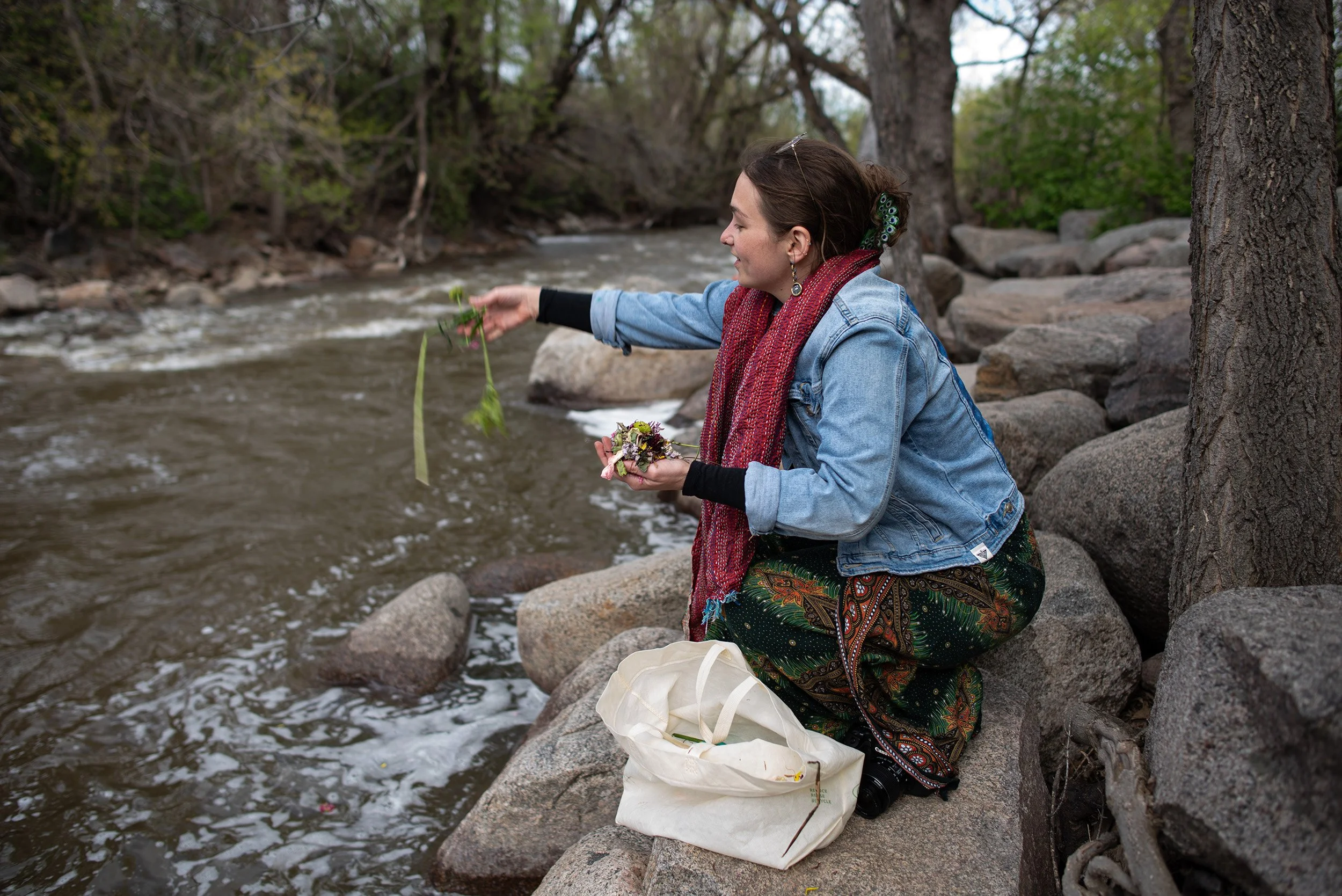 Violet Elder says a prayer for Boulder Creek at Eben G. Fine Park on April 29, 2024. (Jillian Vallance)